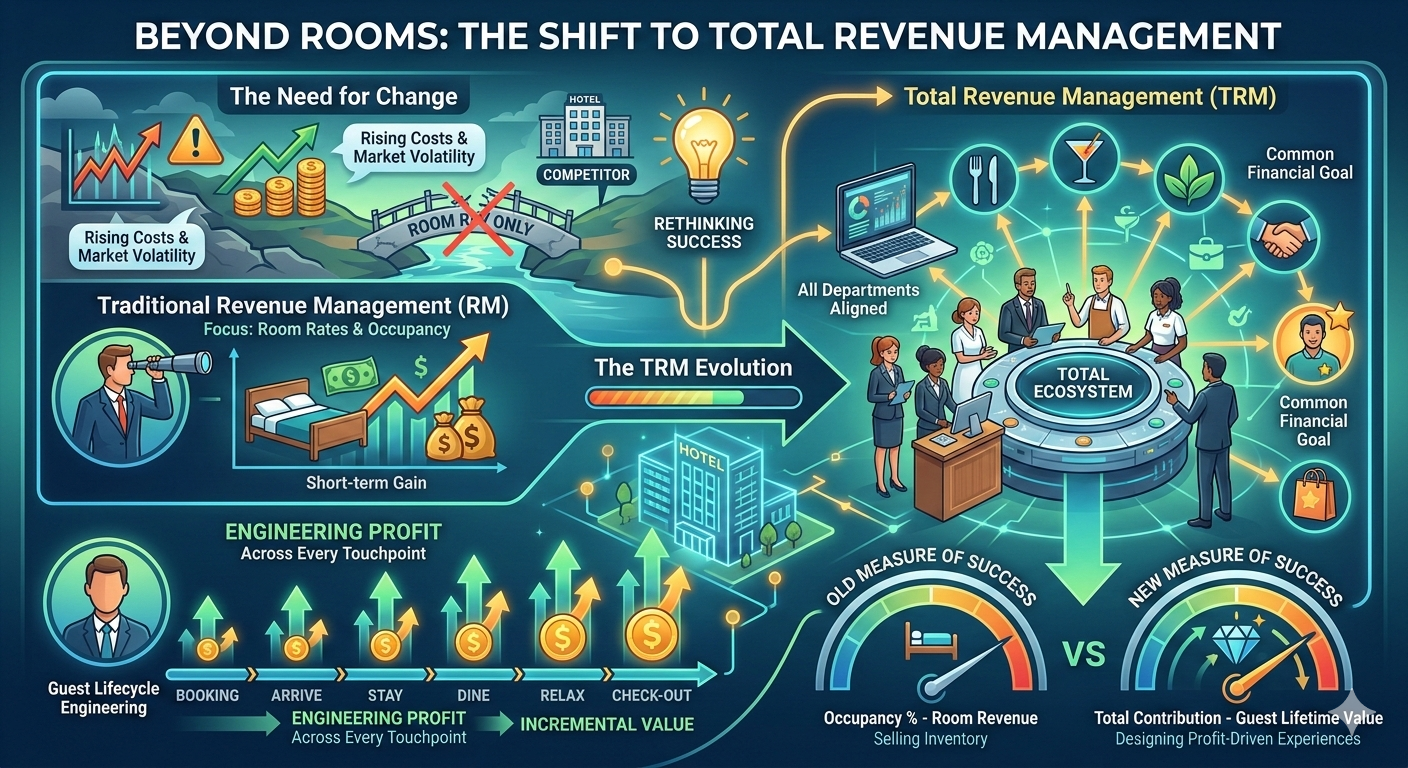Under TRM, success is not measured solely by how many beds are filled, but by how much total contribution each guest generates. The focus expands from short-term room revenue to long-term profitability, asset efficiency, and total guest value.